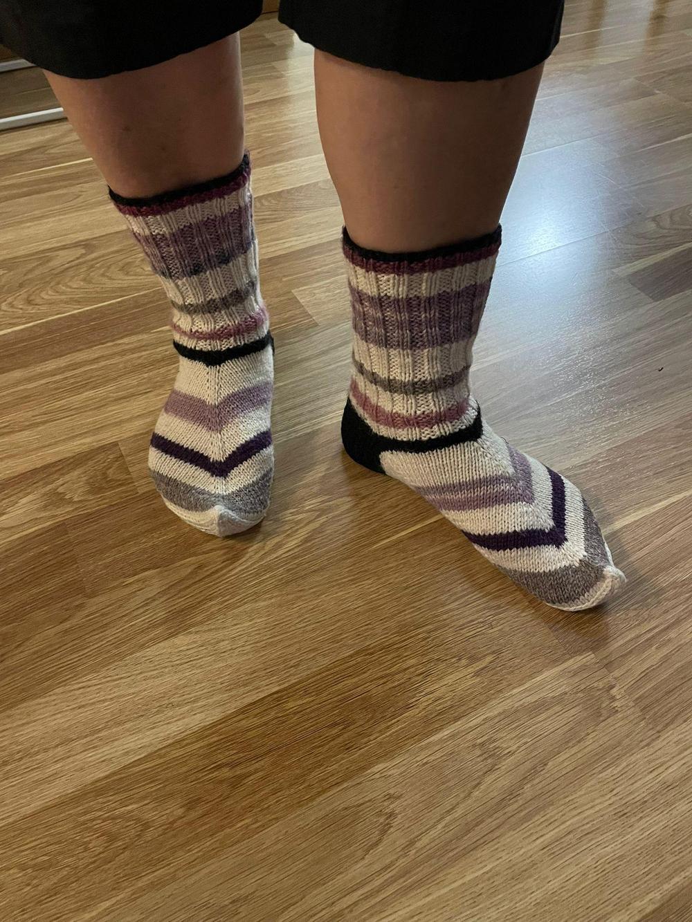 Kannattaa tehdä etukäteen varret kantapäineen valmiiksi niin pääsee heti aloittamaan ”kippurakärkien muotoilun” kavennuksilla ja lisäyksillä.